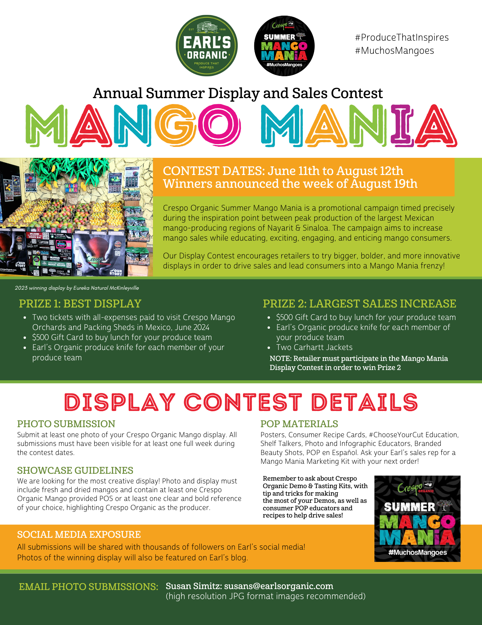 Earl’s Mango Mania Display Contest encourages retailers to try bigger, bolder, and more innovative displays in order to drive sales and lead consumers into a Mango Mania frenzy! The 2025 contest is on now through August 4th. You could be the winner of this year’s contest. Read on for contest details and prizes.
