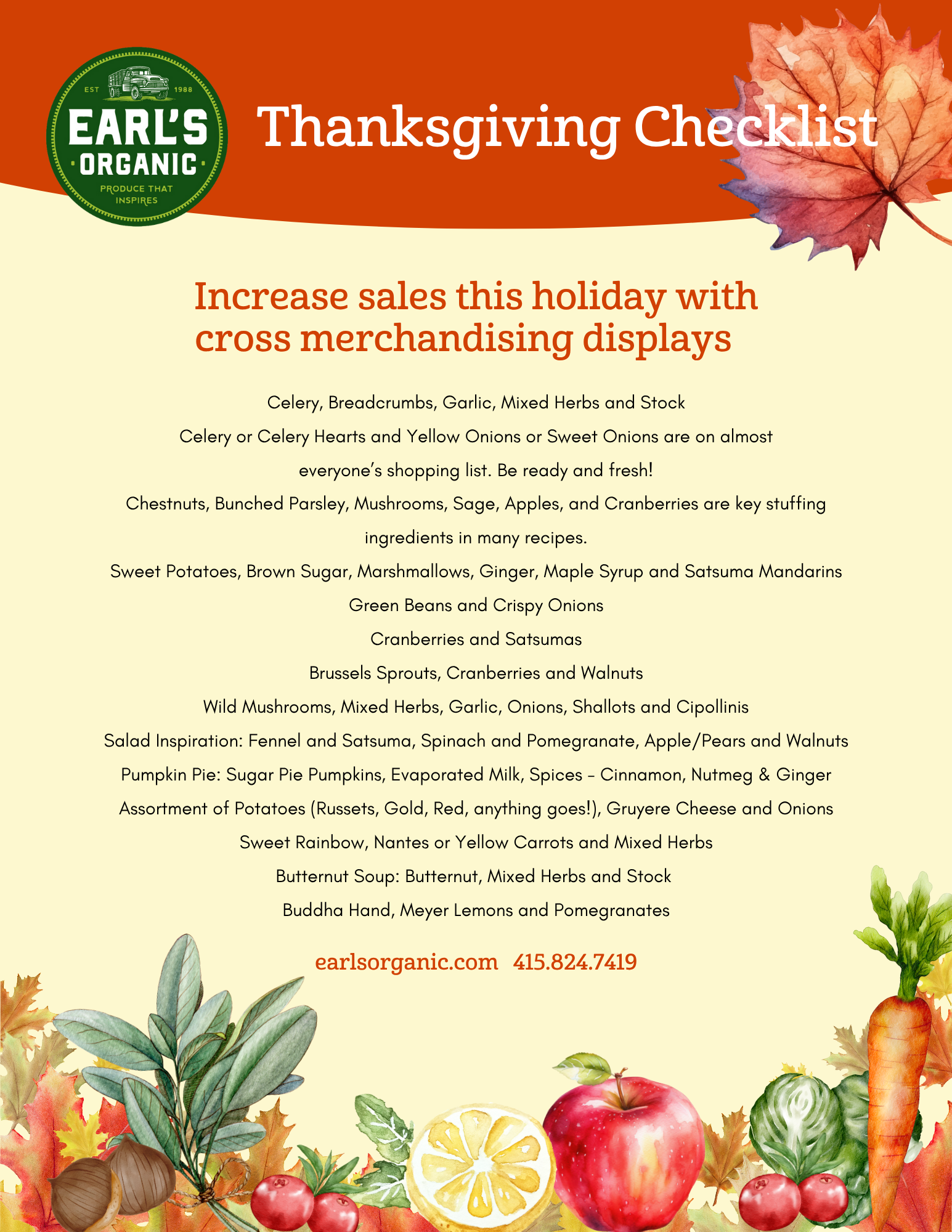 Earl’s Thanksgiving checklist will help your holiday planning go smoothly. Order pre-cuts and herbs early to secure volume. Create an eye catching waterfall display with holiday staples-sweet potatoes, potatoes, onions and hard squash. Mushrooms are historically tight at this time of year. Now is a great time to try some new and exciting varieties.