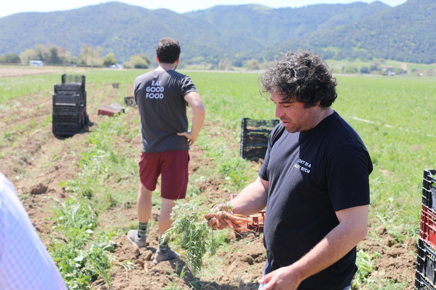 From there, we drove up through the Santa Rita hills to visit their larger plots, only to be surprised by rows of gorgeous, 13-month-old artichokes. It was hot in the hills, and the scent of the plants filled the air while we walked by their side. We passed purple snap peas and mustard greens, before darting across the busy road towards the carrot fields.