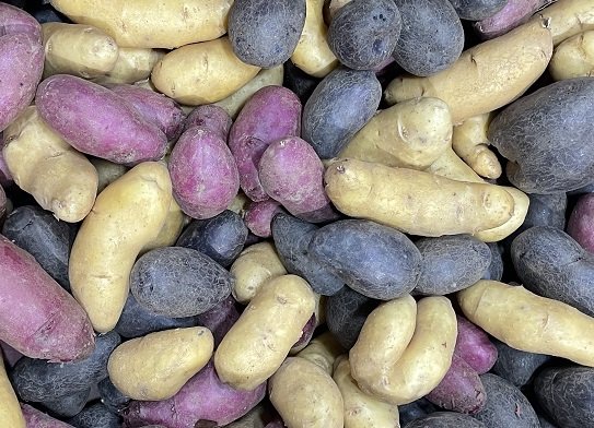 Fresh dug fingerling new potatoes are now in season from Sunrise Organic Farm in Lompoc, California! Sunrise grows beautiful red Amarosa, yellow Austrian Crescent and purple fingerlings. The three fingerling varieties are also offered as a rainbow mix.